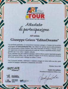 Con profonda gratitudine, le riconosciamo il prezioso sostegno e il talento che ha profuso nel progetto Art International Tour, che vedrà il suo operato esposto nelle prestigiose sedi internazionali di Dubai, Pechino, New York, Principato di Monaco e Venezia. La sua Arte rappresenta un’autentica espressione di creatività, ricerca e sensibilità artistica, distinguendosi per il suo valore e impatto culturale. Il suo contributo non solo conferisce prestigio e autorevolezza a questo importante progetto della Fondazione Effetto Arte, ma rafforza il legame tra le diverse espressioni artistiche del mondo, promuovendo il dialogo tra culture e visioni.